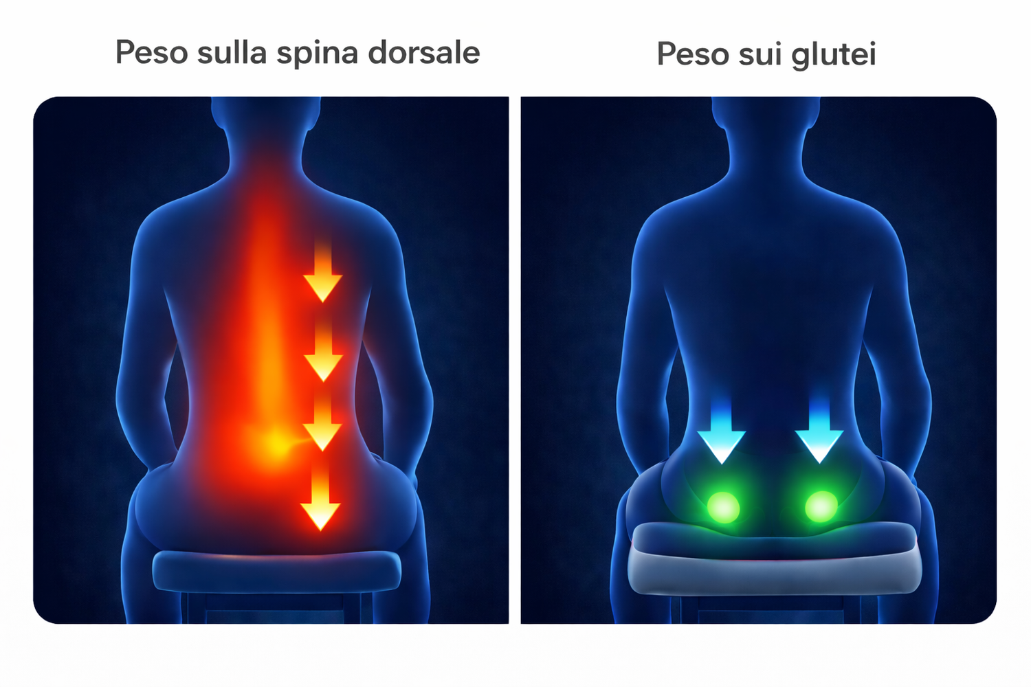 Quando il peso si sposta dalla spina dorsale ai glutei, i muscoli della schiena si rilassano e riesci a stare seduto per ore senza provare fastidio.